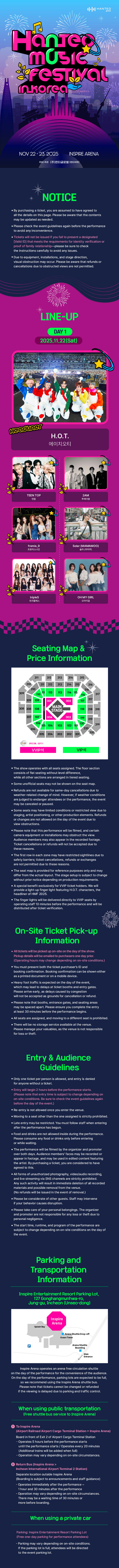 All 2025 HANTEO MUSIC FESTIVAL IN SEOUL tickets will be distributed on-site on the day of the event. Details on the pickup location and time will be emailed exclusively to purchasers on the day before the show (Friday, November 20).